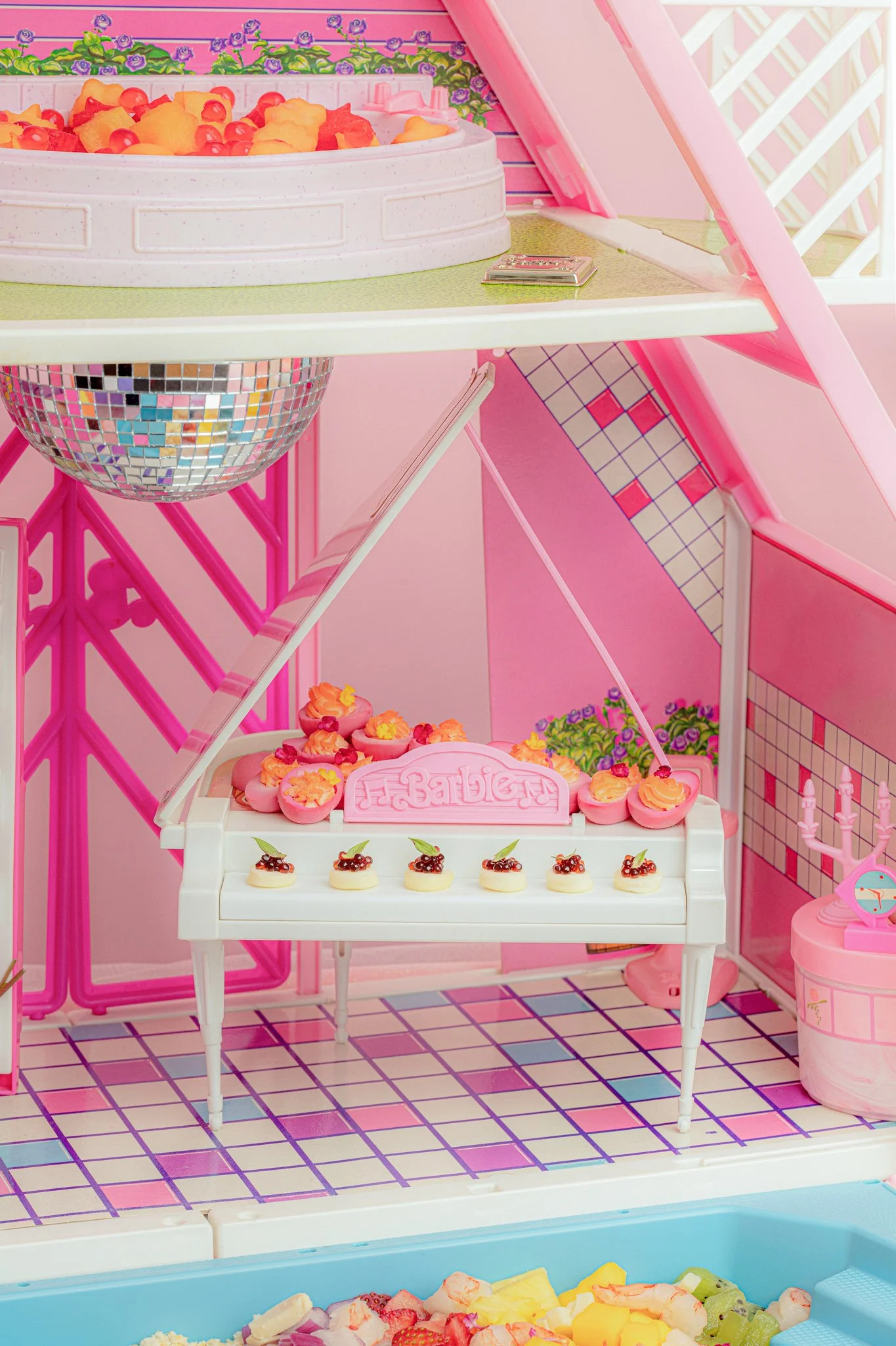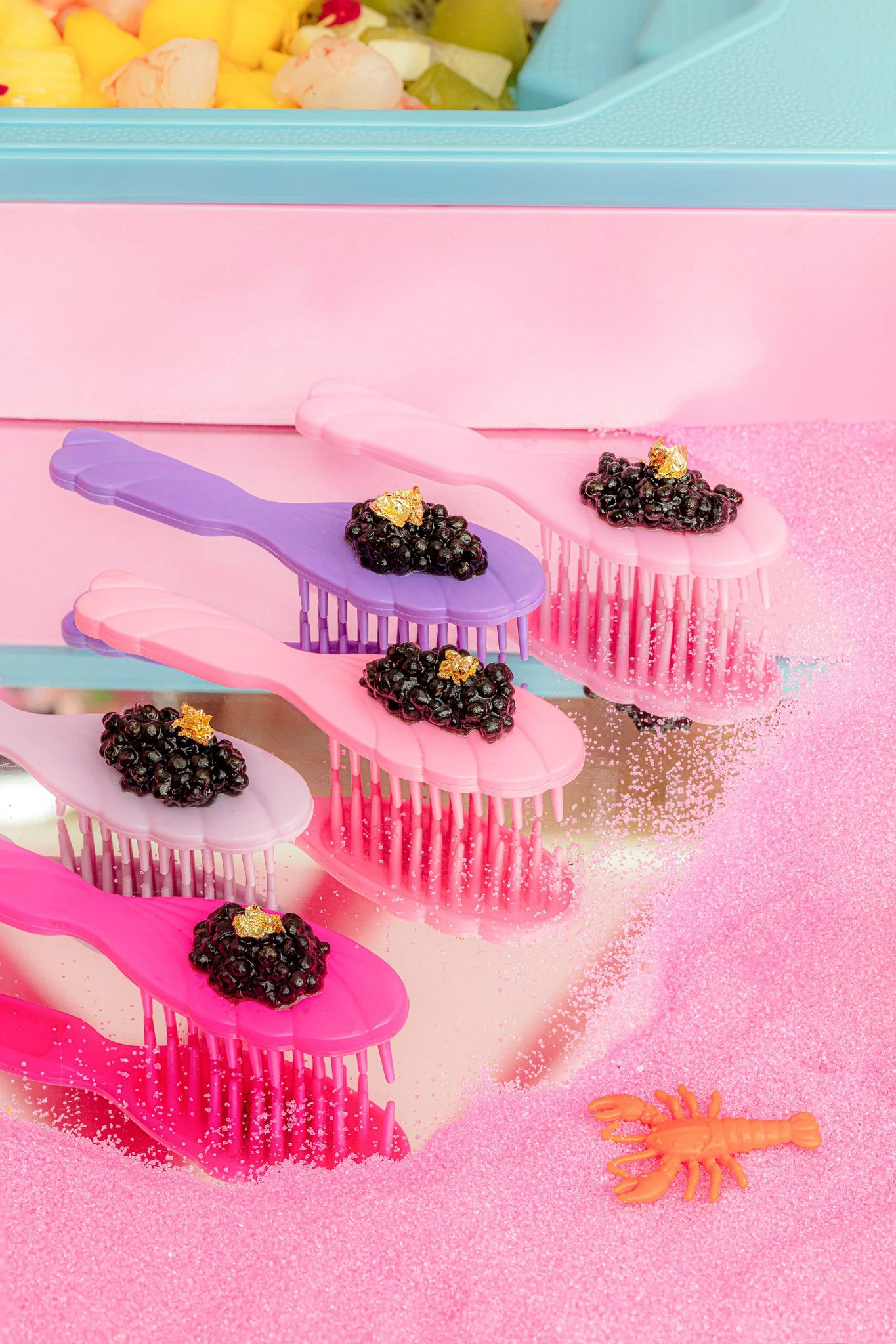 Caviar bumps with edible gold on iconic Barbie brushes on pink sugar sand
